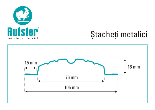 Profilul sipcii metalice Rufster este conceput pentru a oferi un aspect modern si uniform gardului, dar si o rezistenta mecanica ridicata. Canalele de rigidizare contribuie la stabilitatea produsului si la mentinerea formei in timp.