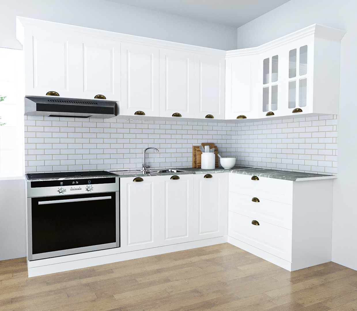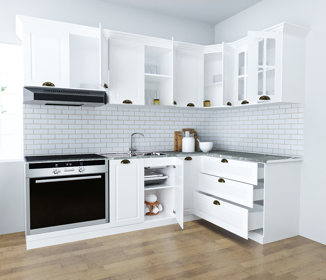 Pareri Set bucatarie colt MDF Square, 240x140 cm, alb rustic